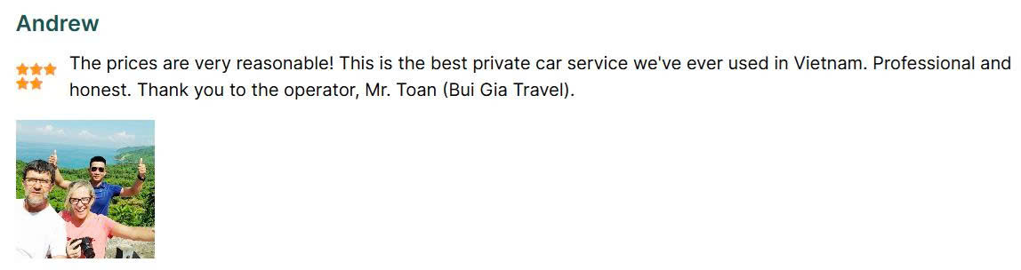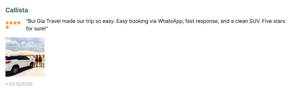 Luggage allowance : If you are bringing many large suitcases (especially if you are an overseas Vietnamese guest), please let us know in advance so we can arrange a vehicle with a large trunk.